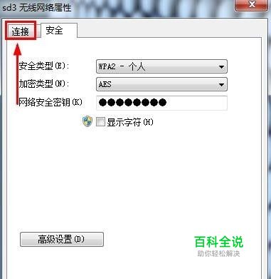 在打开的无线网络属性窗口中,我们切换到连接选项卡。