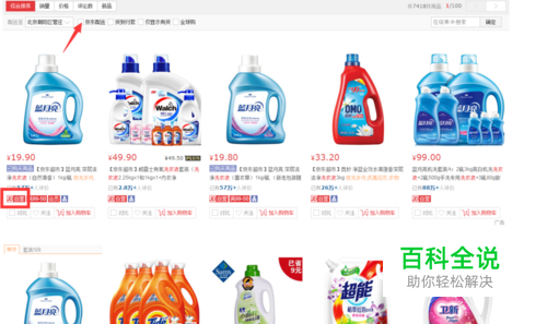 然后我们随便找一款产品,我这里就搜一下洗衣液吧,可以看到一般商品左下方都会有个自营的字样,这种属于自营的商品,左下方没有显示自营字样的商品则是第三方商品,我们也可以勾选一下上面的京东配送,这样大部分的都是自营的。