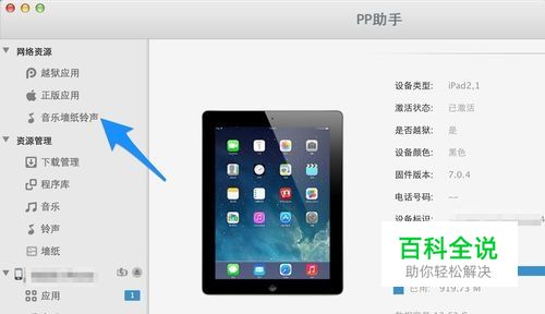 iPad 上的闹钟铃声是使用的系统自带的铃声,可能有好多朋友想更换一些自己喜欢歌曲之类的铃声。如果你的 iPad 还未越狱的话,那我们可以借助第三方软件来设置铃声。这里以 PP 助手为例,可以看到在左侧上方有 “音乐墙纸铃声”选项,点击它,如图所示
