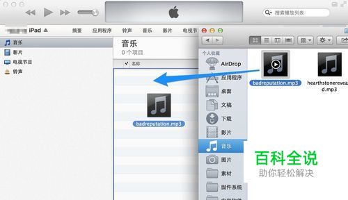 接着把我们电脑上存放的音乐,手动拖动到 iPad 上的音乐框中,如图所示