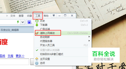 首先在浏览器中删除上网记录,点击菜单栏“工具”选项,然后点击“清除上网痕迹”,不同浏览器清除方式大同小异。