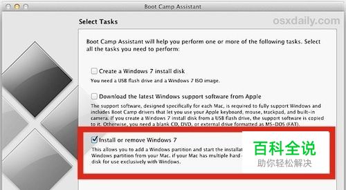 1 进入Mac系统 2 打开“Boot Camp助手”应用程序; 3 选中“Install or remove Windows 7 or later version”(安装或移除WIndows 7及后续版本),点“下一步”,然后再点”下一步“。