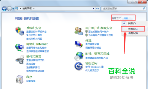 打开控制面板之后,如果是以分类显示的,首先点击右上角的查看方式,然后选择“ 大图标”。(如果是以大图标显示的,则可以跳过这一步)