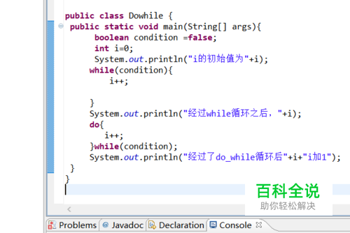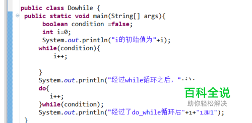 创建一个类.CLASS文件,建一个main方法。 写入下面代码体验一下两者的区别。 boolean condition =false; int i=0; System.out.println("i的初始值为"+i); while(condition){ i++; } System.out.println("经过while循环之后,"+i); do{ i++; }while(condition); System.out.println("经过了do_while循环后"+i+"i加1"); } 具体参考下图。