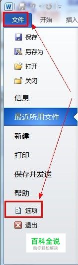 打开Word 2010,单击左上角的“文件”按钮,在弹出的左侧列表单击“选项”命令
