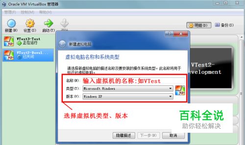进入新建的页面,我们可以看到有多种系统供用户选择,这里先输入虚拟机的名称,如VTest,选择版本“Microsoft Windows”,类型选择“Windows xp”,点击下一步。