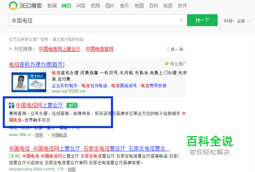 在浏览器中搜索,中国电信,看到有个网页标注官网,点击打开“中国电信的官网”