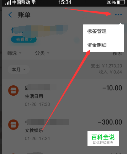然后我们点击账单右上角的【三个小点】并在弹出的选项点击【资金明细】