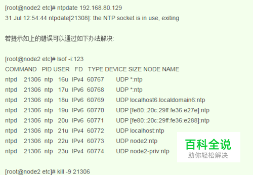 这里只要使用kill -9 PID,杀掉ntpd产生的进程号21306就可以了