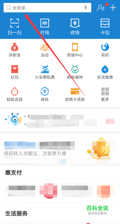 打开支付宝app,直接点击支付宝最上面的搜索框,如下图所示。