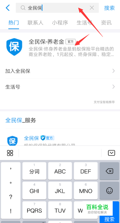 在支付宝搜索框里搜全民保,然后直接点击支付宝全民保养老金,如下图所示。