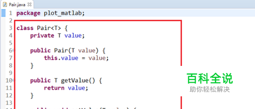 第二步通过class Pair<T>{}方式定义泛型类Pair,里面添加一个value变量和构造方法,get,set方法,如下图所示: