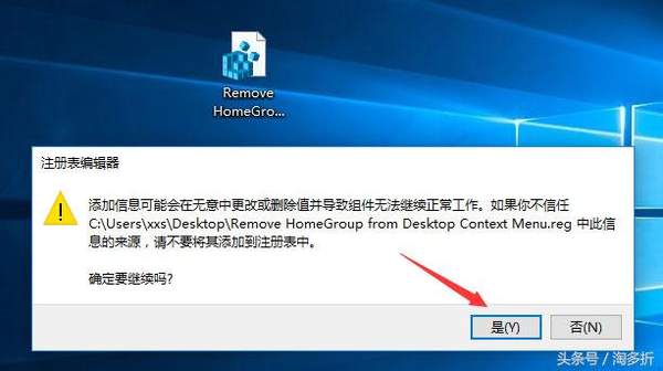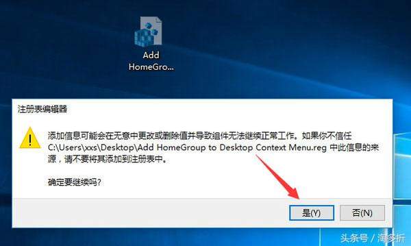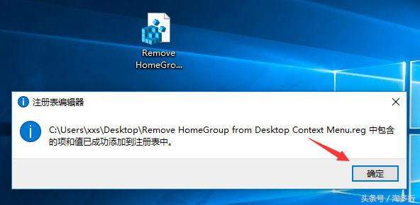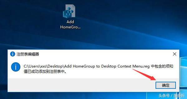 4、这样桌面就出现了恢复用的注册表文件,同样双击运行该注册表文件,在之后出现的提示框,点击“是”、“确定”即可;