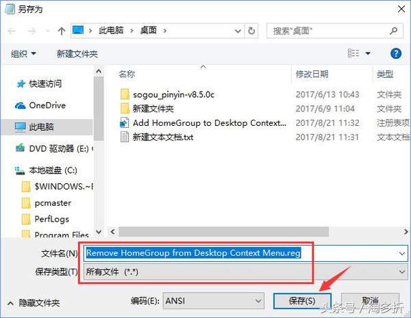 3、保存类型同样为“所有文件(*)”,文件名这里小编设置为“Remove HomeGroup from Desktop Context Menu.reg”;