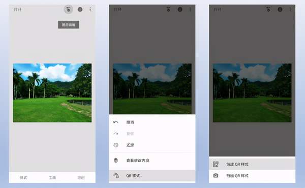 那么假设现在我们调好照片准备导出了,那是要点击snapseed主界面右下角的“导出”吗?当然是,但不是现在,现在我们要导出的叫“QR样式”,它是为我们以后使用“全尺寸成品”服务的,虽然这是谷歌为用户分享“修图步骤”准备的功能,但我认为用在照片的导出上更能发挥它的最大价值,同时也不浪费分享功能。