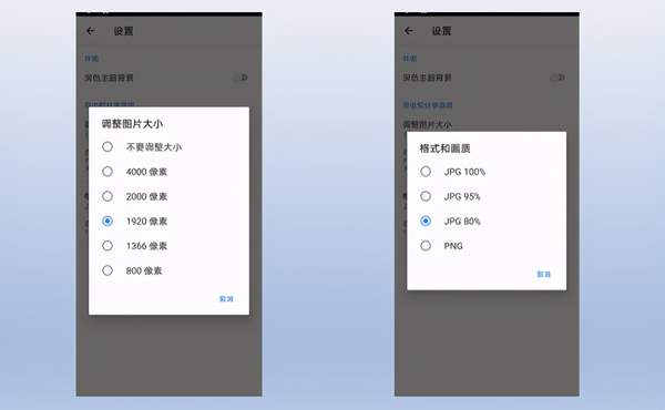 首先点击主界面的“更多选项”,再点开“设置”就会看到如下界面,有“调整图片大小”和“格式和画质”两个可调整的选项,分别对应“分辨率”和“压缩率”。
