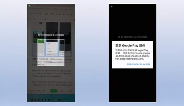 这里需要说明一下扫描的注意事项:一个是它不支持扫描本机图片,也就是只能对着另外一台设备扫描;另一个是不支持没有搭载Google Play服务的手机,也就是华为系的部分手机无法使用这个功能。