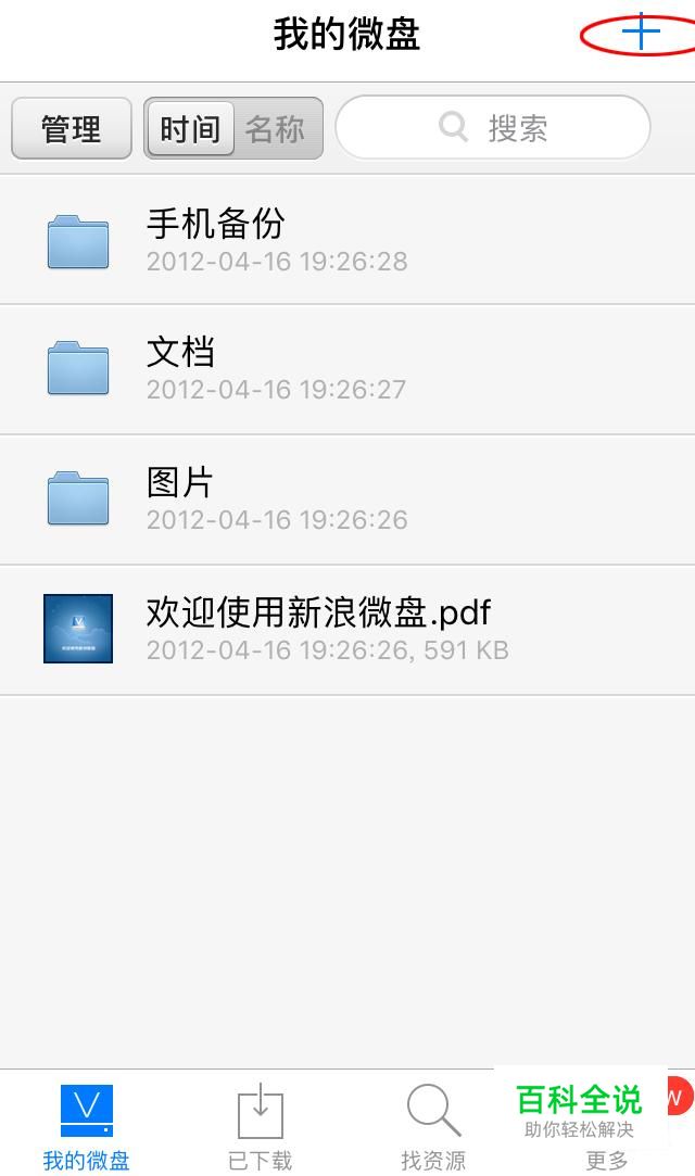 登录完毕,可以看到我的微盘可以手机备份、保存文档、保存图片等。要上传东西,点击右上角的加号。