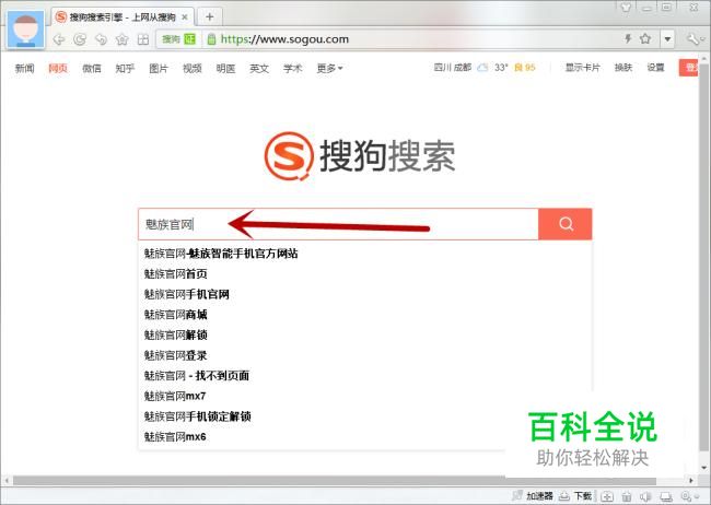 用电脑打开搜狗浏览器,输入手机型号官网。(以PRO6为例,输入魅族官网)