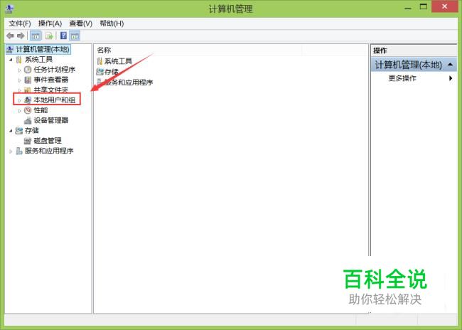 点击管理选项,在弹出的对话框中找到本地用户和组选项,如图所示: