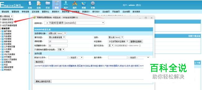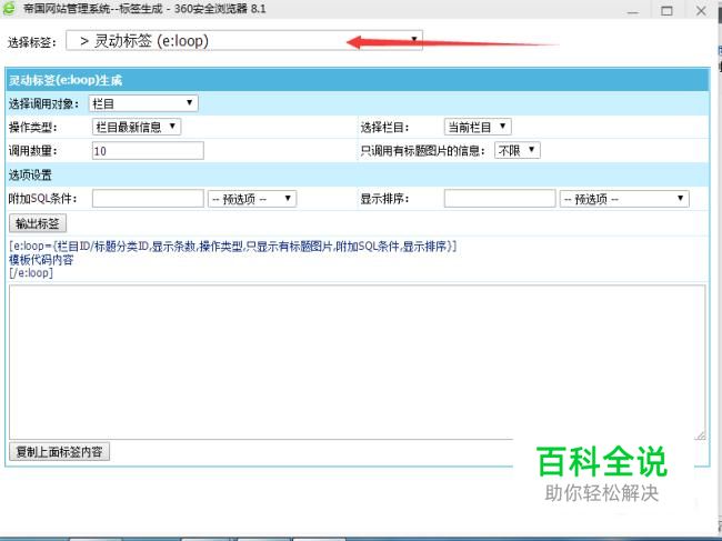 下面的选项里按自己的业务要求选择,这里以栏目为例,点击输出标签,代码就自动生成了。