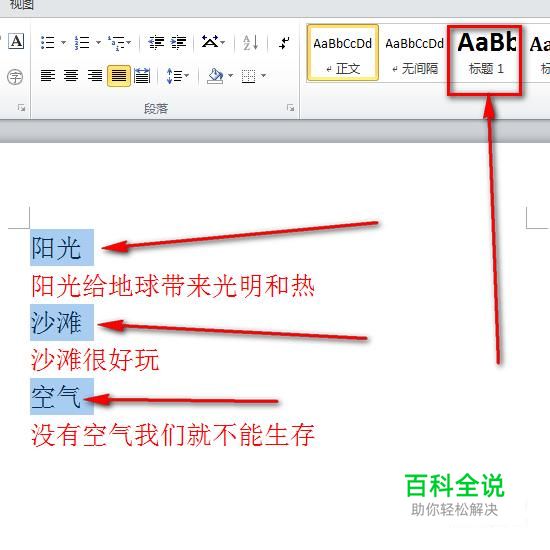 然后我们选择所有的标题,在开始菜单下找到“标题一”样式,然后给标题添加“标题一”样式。