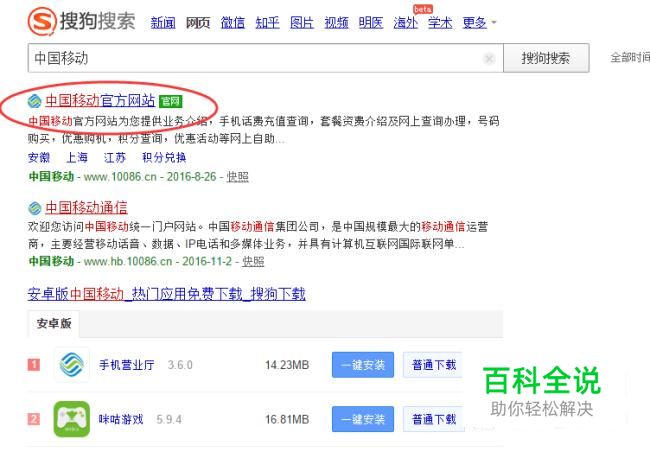 首先,通过搜狗搜索“中国移动”来进入中国移动官方网站。