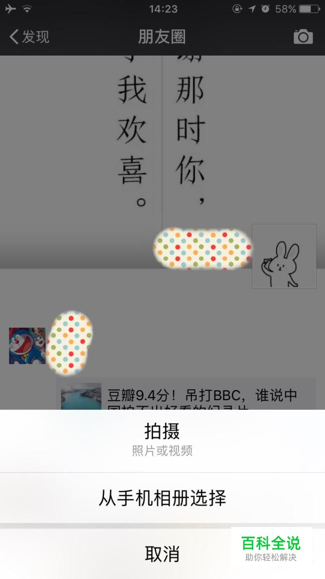 在朋友圈界面点右上角的照相机图标,下方即出现“拍摄”(照片或视屏),“从手机相册选择”。
