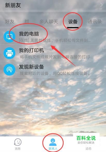 那怎么上传电脑呢?首先,电脑登录QQ账号,然后打开手机QQ,选择“联系人”—“设备”—“我的电脑”,如图。