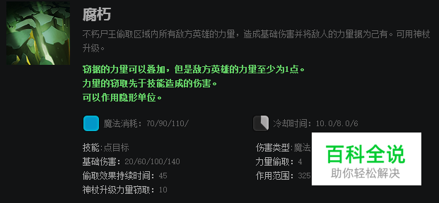 腐朽能够窃取敌方英雄的力量值并且造成伤害,窃取到的力量值加到自己身上,技能效果可以叠加。