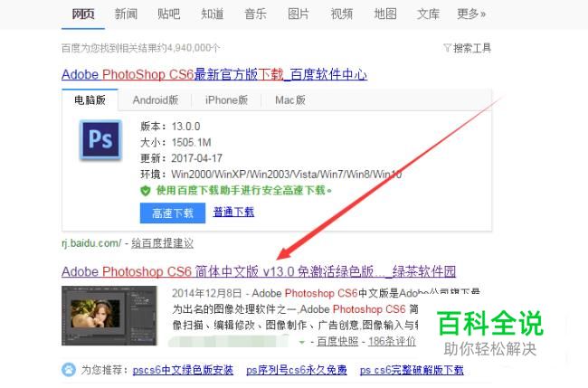 接着再出现的网页找到“Adobe Photoshop CS6 简体中文版 v13.0 免激活绿色版...”,出现的应该是第二个,运用的是“搜狗搜索”。