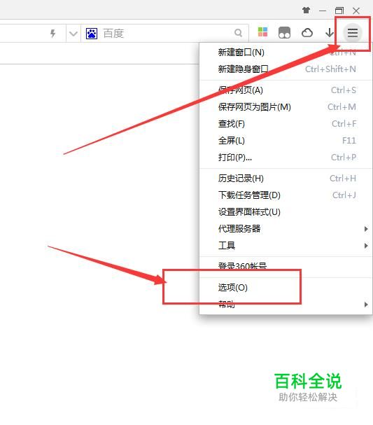 如图,打开360极速浏览器,在右边菜单的下拉菜单中点击“选项”。