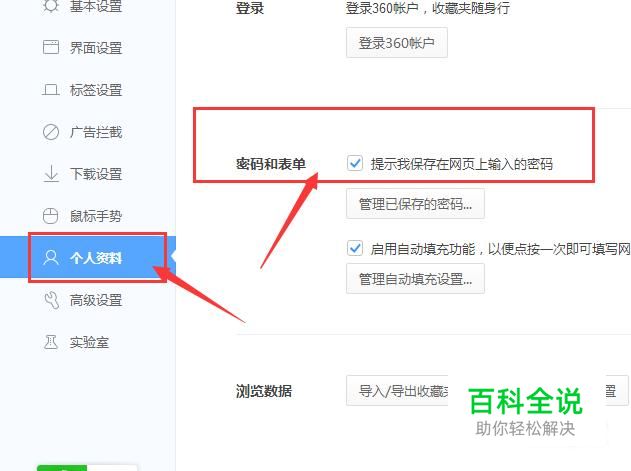 然后点击“个人资料”,然后把“提示我保存在网页输入的密码”给勾选上。