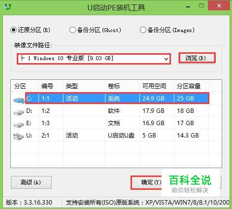 将制作好的u盘启动盘插入电脑usb接口,重启电脑,在uefi启动模式下会自动启动u盘,然后直接进入win8pe系统,弹出u启动pe装机工具,点击浏览按钮选择win10系统镜像,以c盘做系统盘,点击确定
