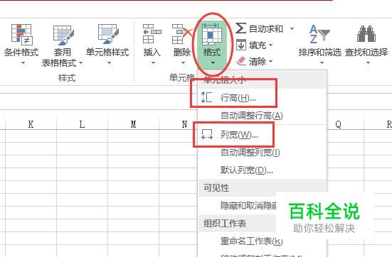 在开始菜单栏找到“格式”,如图,我们可以看到展开的选项栏中有“行高”和“列宽”的相关设定。