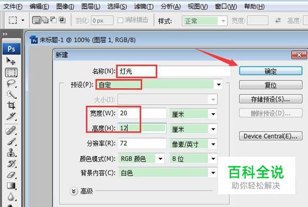 运行Photoshop,点击“文件--新建”,在新建选项卡,命名为“灯光”,预设为“自定义”,背景色为“白色”,点击“确定”。