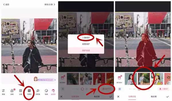 最后一个简单粗暴的方法,直接把照片背景换成简洁干净的背景。选择美图秀秀中的「马赛克」工具,选择虚化效果的马赛克,打开「人像保护」功能,人物就不会被涂抹到,然后就可以粗鲁地涂抹了。