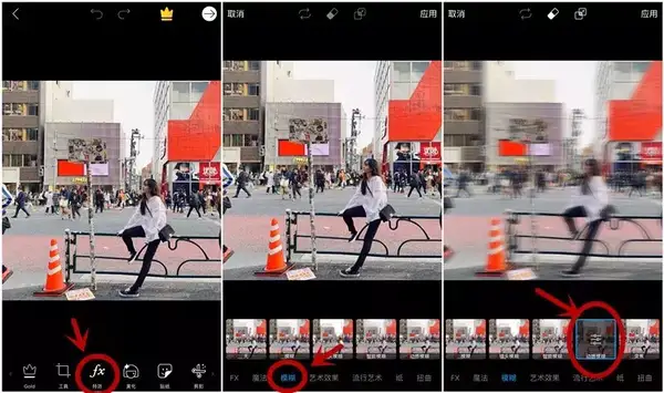 导入要处理的照片,在屏幕下方的工具栏中选择「特效」——「模糊」,镜头模糊和动感模糊都是可以的。