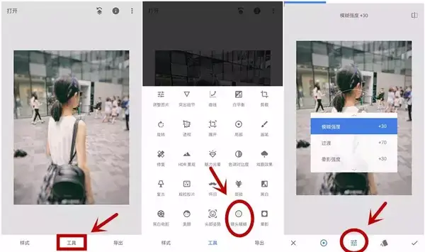 在工具栏里,选择「镜头模糊」功能。先把虚化范围双手缩放至最小,调节模糊强度,选择右下角的「✔」。