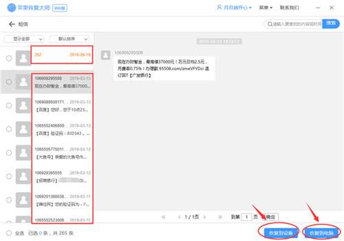 扫描完成后即可查看恢复出来的数据了,其中已删除的短信是单独用橙色字体显示的。勾选需要的短信,点击右下角的“恢复到电脑”或“恢复到设备”均可完成恢复操作。