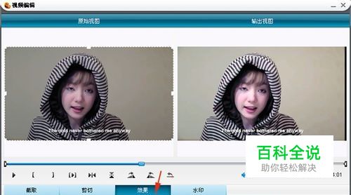 点击【视频编辑】进入编辑视频的功能面板,里面有视频截取、剪切、效果、水印等功能。选择效果选项,在其下方,有亮度、对比度、饱和度、音量缩放等参数设置,拉动亮度或者对比度的下方拉动条来调节视频的亮度,这时界面的上半部有两个视野窗口,左边的是原视频的视频效果,而右边则是调节相关参数后视频的预览。