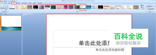 ppt界面出现第一张幻灯片,出现的幻灯片的样式可能不是你想要的,接下来教你如何进行ppt样式设置,点击导航栏上的“设计”,进行选择ppt自带的模板样式