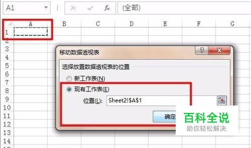 步骤二:设置移动位置 弹出“移动数据透视表”对话框,设置移动位置,如在此单击“现有工作表”单选按钮,设置为Sheet2工作表中的A1单元格,最后单击”确定“按钮,如下图所示。