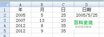 选择D2单元格,输入“=DATE(A2,B2,C2)”,按回车,即可将数值转换为日期显示。