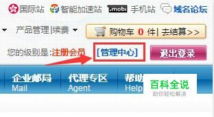 解析域名之前,需要先找到服务器的解析地址。登录西部数码,然后点击主页右上角的“管理中心”。