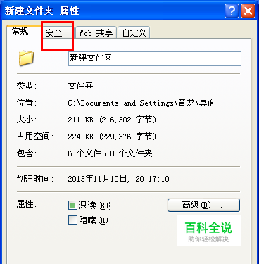 设置好后单击需要设置文件夹权限的文件夹,右键选择“属性”,在窗口里有一个“安全”页签