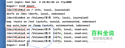首先,我们打开终端,输入 mount 这条命令是为了获取系统硬盘的挂载路径和设备号。 图中,红色标记是设备号,蓝色标记是挂载路径,绿色标记是分区格式。 (这是我电脑里的位置,别的电脑应该会有一定的区别,所以一定要先用mount命令查看) 然后,最好把这段内容保存起来,因为以后我们挂载分区的时候会用到。 保存起来就不用每次都输入mount查看了。