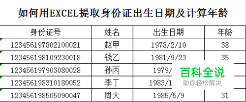 身份证号码的数字都有其具体的意义,从这些数字中可以获得该号码所对应人员的出生户籍地、出生日期、性别等基本信息。利用EXCEL函数,可以很方便的提取身份证号码中的出生日期信息,并计算出年龄。