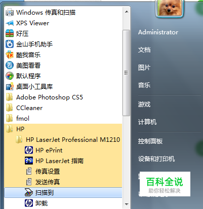 找到开始菜单-所有程序-找到hp-找到扫描到按钮。