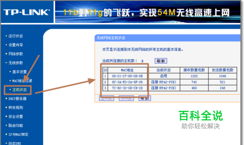 进行无线参数中,查看连接WIFI的有多少个主机数量的MAC地址,若只有一个人那么主机数应该是2,一个是你的自己的设备的MAC,还有一个是路由器WIFI的MAC地址。在自己的设备上查看自己的MAC地址是多少,再与路由器中对照,若是不你的自己的MAC地址,那么这个设备就是蹭网的。